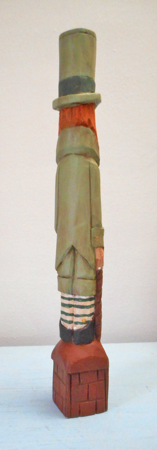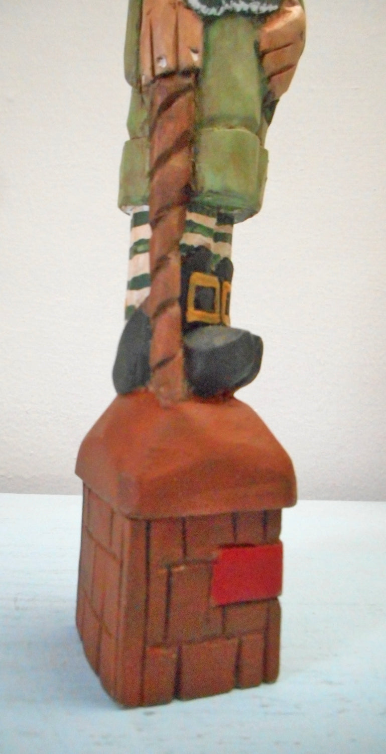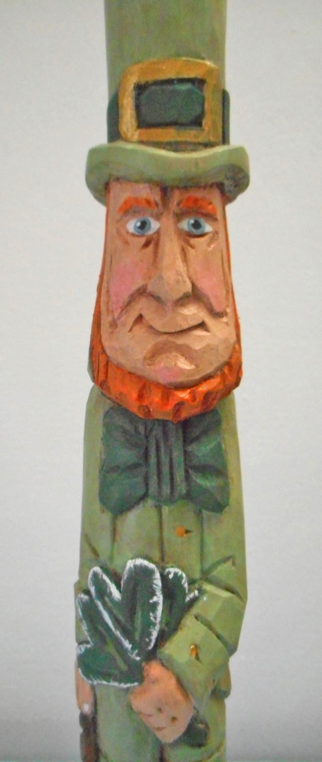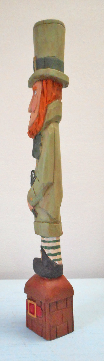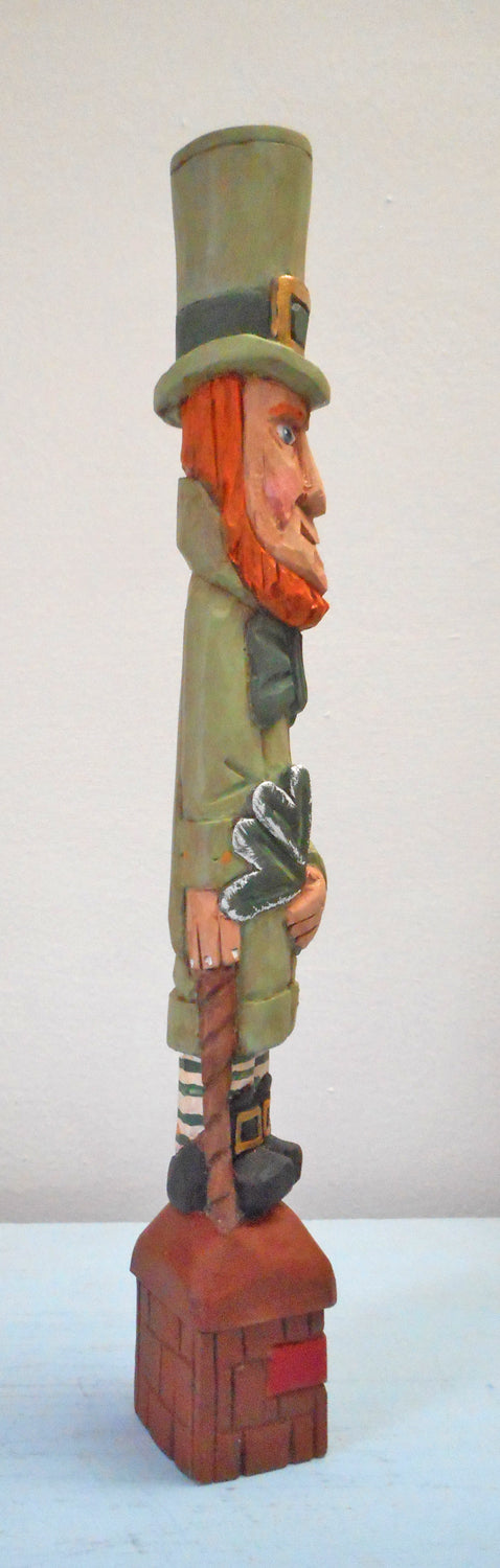 In Irish folklore a Leprechaun is an elf that look like a wrinkled old man . This unique Leprechaun is carved from basswood and is intricately hand-painted to enhance details. Shown with a shamrock, cane and on a chest of gold !