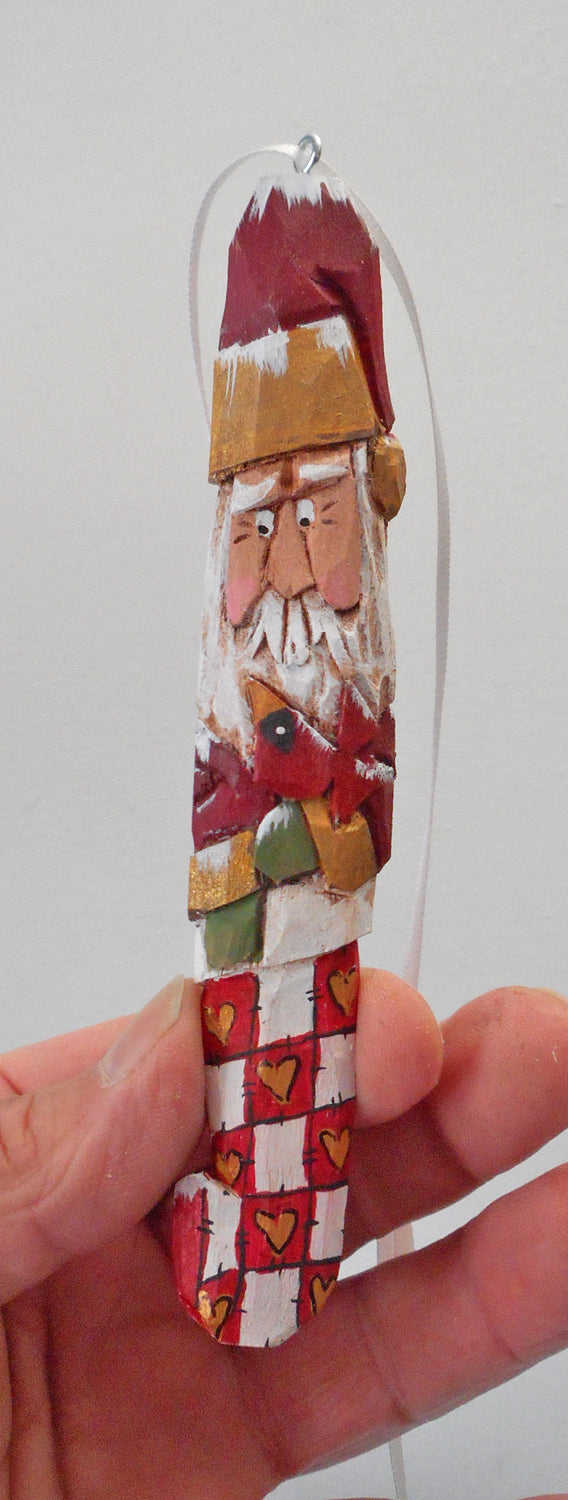 Hand Carved Santa Claus Ornament with Cardinal