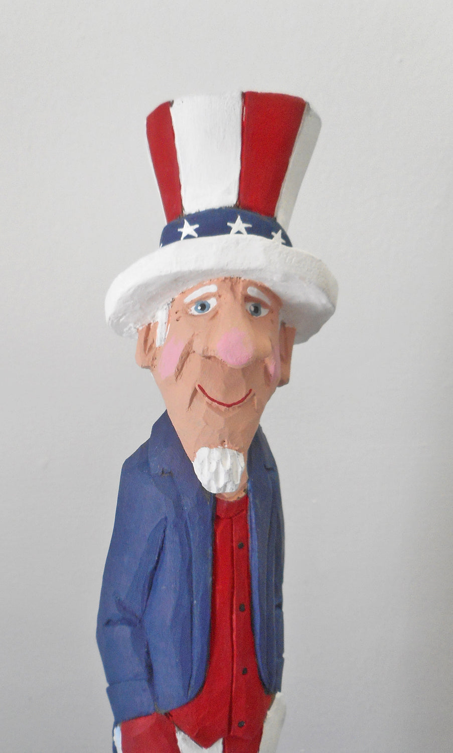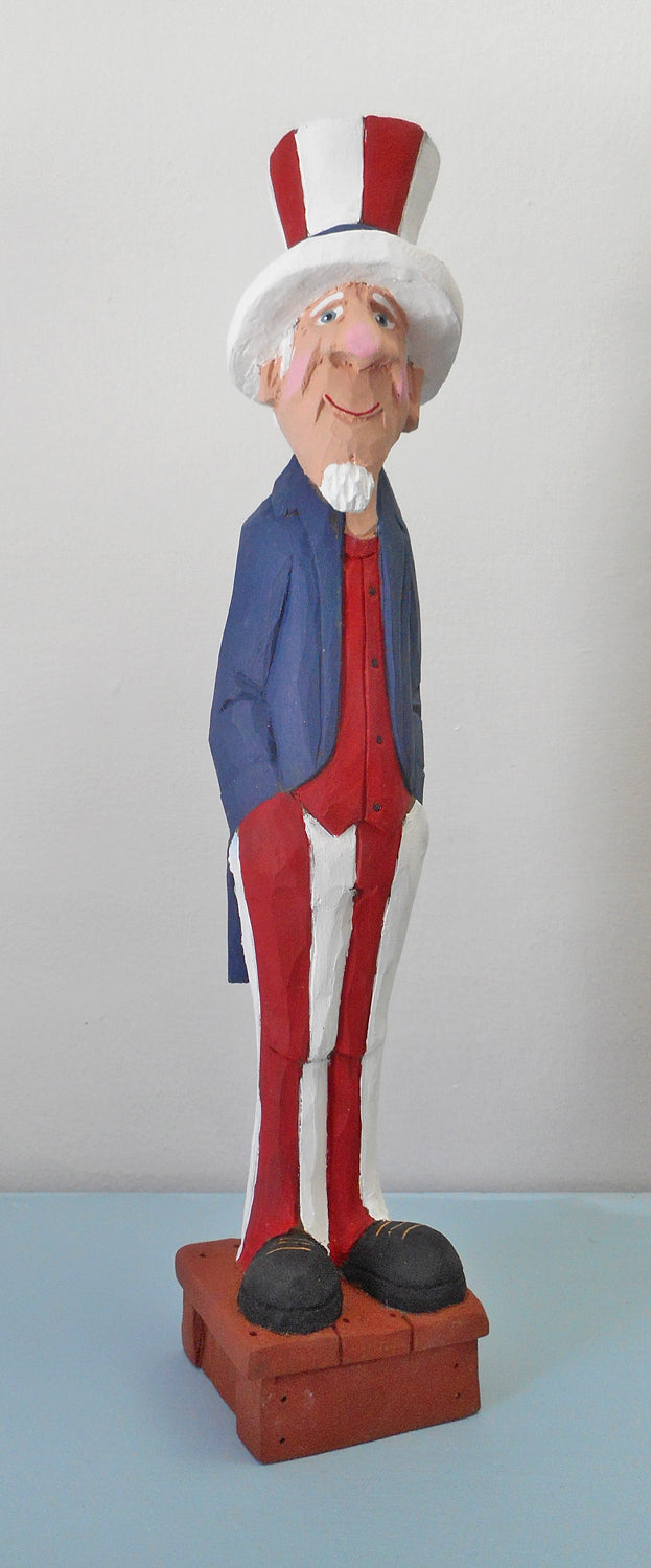 Add star-spangled style to your 4th of July celebration. This hand carved Caricature Patriotic Sam is shown holding a American flag. Hand painted in acrylic, a great holiday gift or decoration for your home or office.