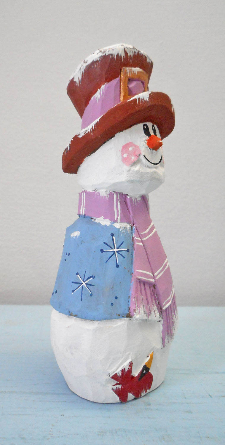 This hand carved wooden folk snowman with Cardinal is sure to put a